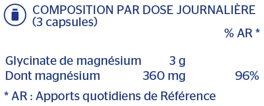Minéral essentiel pour le métabolisme énergétique, les os et les muscles (y compris le myocarde) sous une forme hautement biodisponible. Le magnésium contribue à :